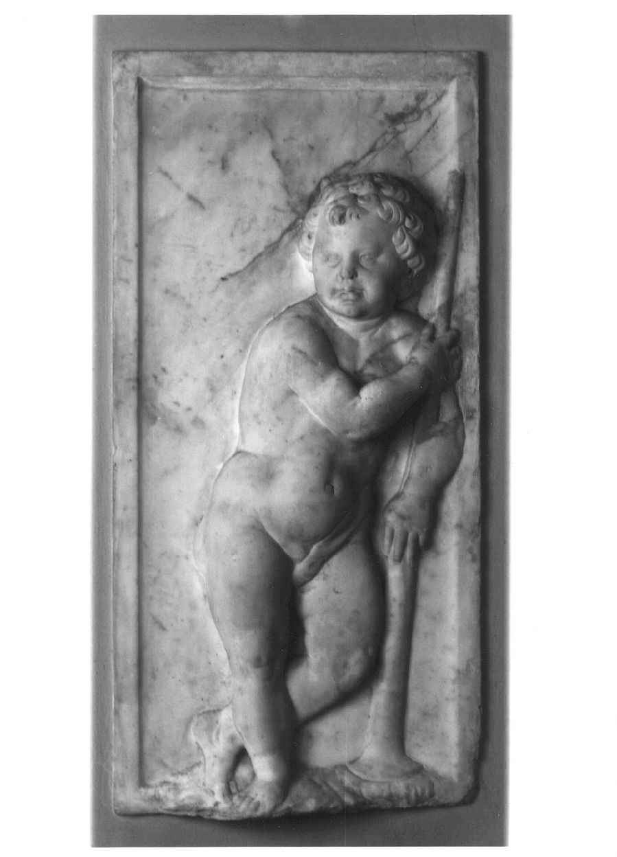 Riquadro rettangolare in marmo bianco con fascia liscia di contorno e figura a rilievo al centro. L'angelo regge con le mani una fiaccola rovesciata.. Figure: angelo