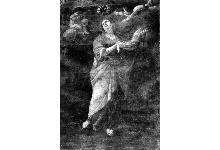 L'opera in esame ad olio e pelli di animali su velluto blu si presenta con una stesura cromatica tormentata e irruente raffigurante una figura religiosa