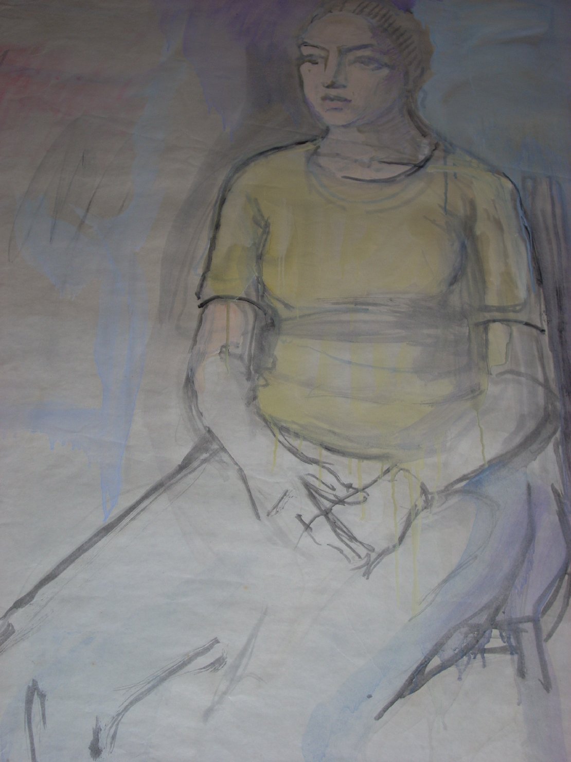 Ragazza con maglietta gialla, figura femminile seduta (disegno)
