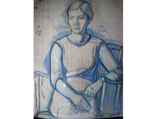 Donna sorridente con capelli legati, figura femminile seduta (disegno)