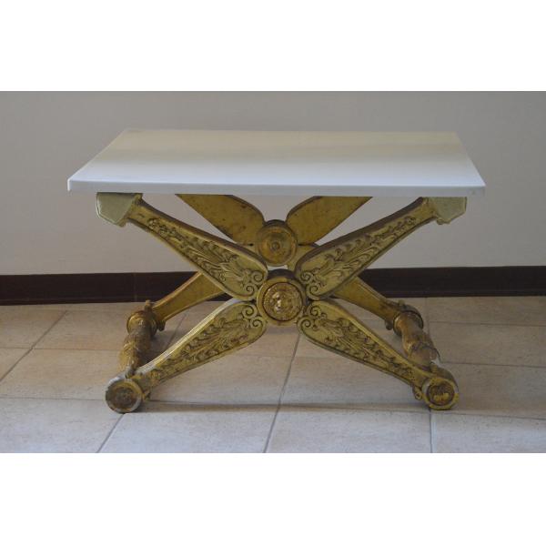 Esemplare singolo di una serie di tre sgabelli in legno con decorazioni dorate, trasformati successivamente in tavolini mediante asportazione del sedile e sostituzione dello stesso con un piano di marmo bianco. I montanti a profilo triangolare opposti dorati sono ornati da racemi fioriti e fogliati centrati da un tondo modanato ornato da un rosone con una testa leonina. Traverse di raccordo con motivi vegetali.. Decorazione: motivi decorativi vegetali e floreali