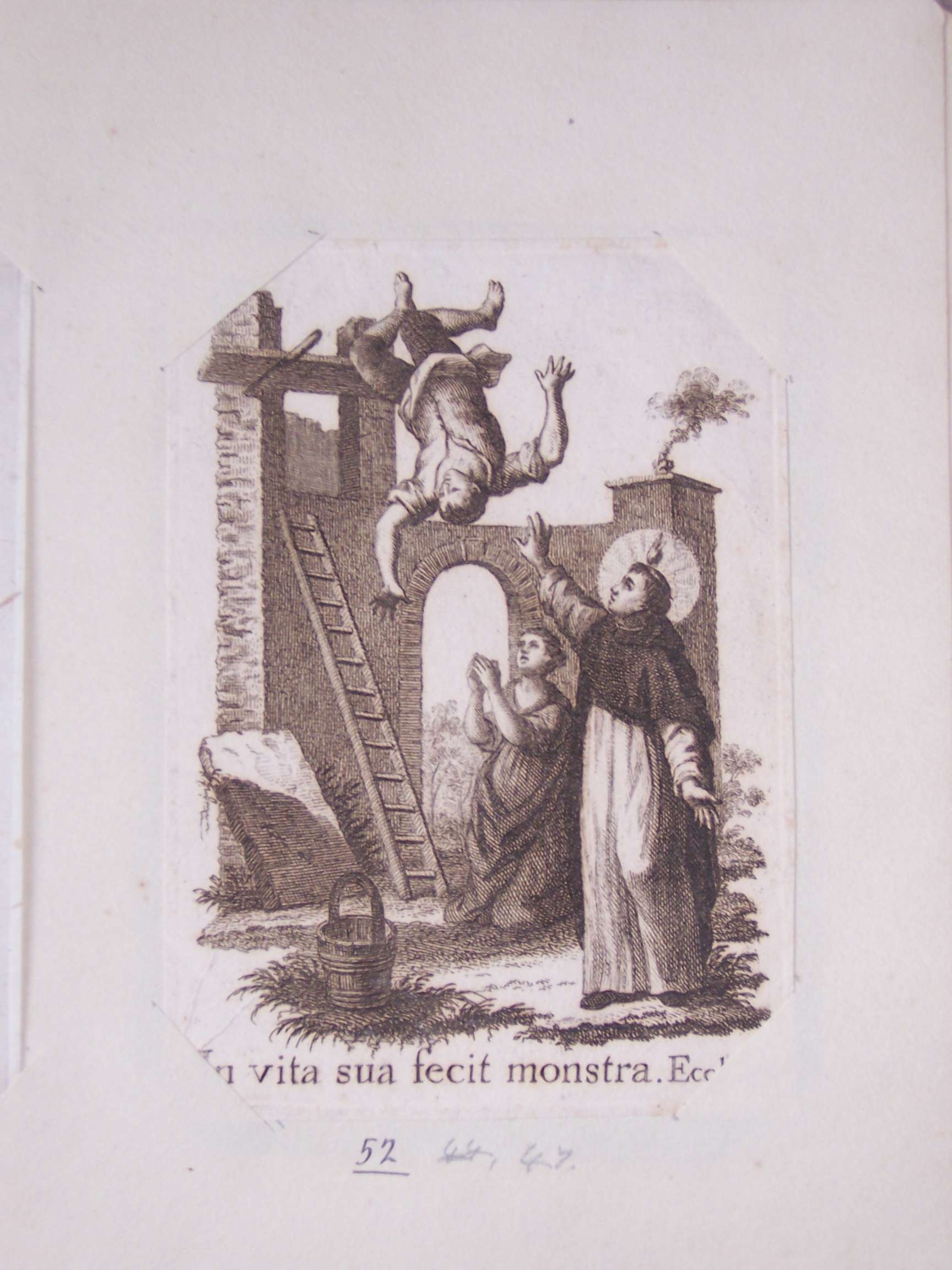 Soggetti sacri: un uomo cade da un ponteggio una donna prega e un santo con una saio e l'aureola interviene per salvarlo