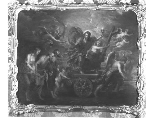 dipinto con cornice. Personificazioni: (Fede cattolica) Figure femminili. Figure maschili. Figure: angeli; cherubini. Attributi: (figura femminile) ostensorio. Mezzi di trasporto: carro trionfale. Animali: bianchi destrieri. Simboli: colomba (dello Spirito Santo). Armi: spada