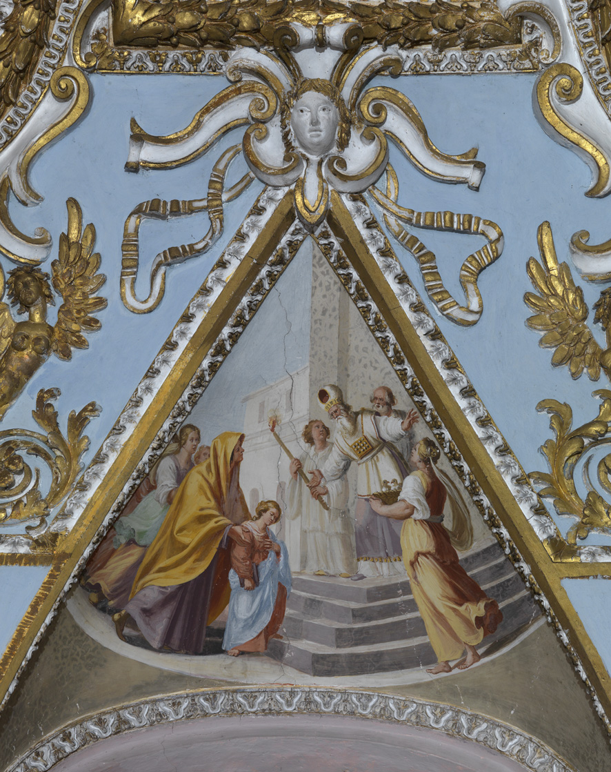 Personaggi: Maria Vergine; Sant'Anna. Figure: sacerdote. Architetture: tempio. Figure maschili. Figure femminili