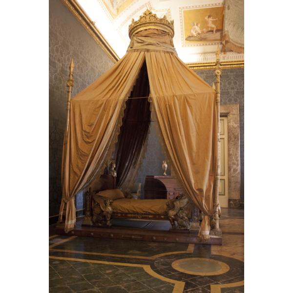 Letto en bateau in legno intarsiato con spalliere decorate da ornati di bronzo dorato. Le spalliere raffigurano un genio alato che fa cenno di tacere (piedi) e un genio alato che riposa (testa). I quattro angoli sono arricchiti da una raffinata decorazione a tutto tondo: quattro erme raffiguranti, tra gli altri, tra le quali Pallade e Marte con elmo di piombo dorato, ai lati della spalliera e dei piedi. Al di sotto di questi, 4 leoni alati poggianti su basi di mogano. La predella in noce in 4 pezzi è guarnita da 42 rosette, delle quali alcune mancanti. Sulla base poggiano 4 picche d'asta di legno intagliato e dorato. La struttura termina con l'alto baldacchino sovrastato da una corona.. Figure: geni alati, Marte, Pallade. Animali: leone alato. Decorazione: motivi decorativi a rosette