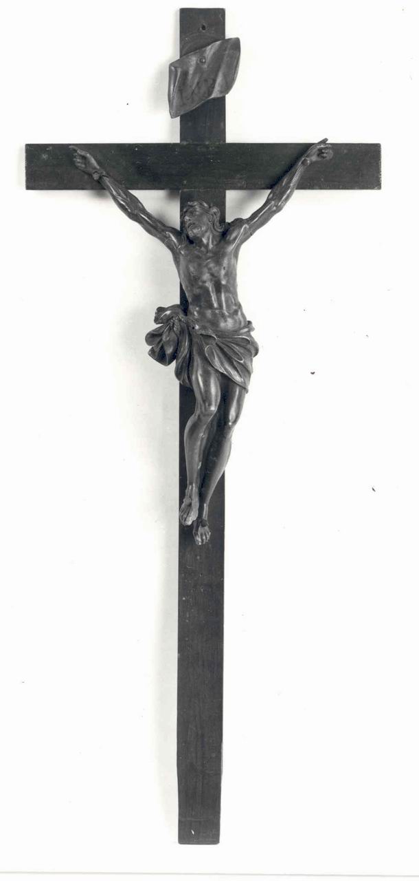 Sulla croce latina è applicata la figura di Gesù Cristo, con il busto inarcato verso destra, i fianchi ricoperti da un ricco drappo, annodato sul fianco sinistro, da cui diparte un ricco lembo avvolto in molteplici pieghe, e la gamba sinistra leggermente piegata. Il volto, inclinato verso l'alto, è rivolto a sinistra. In alto, è applicato il pannello, increspato e inclinato verso sinistra, dove è stata dipinta la scritta INRI.. RELIGIONE CRISTIANA. PERSONAGGIO: Gesù Cristo. CRISTO CROCIFISSO IN UN CONTESTO NON NARRATIVO