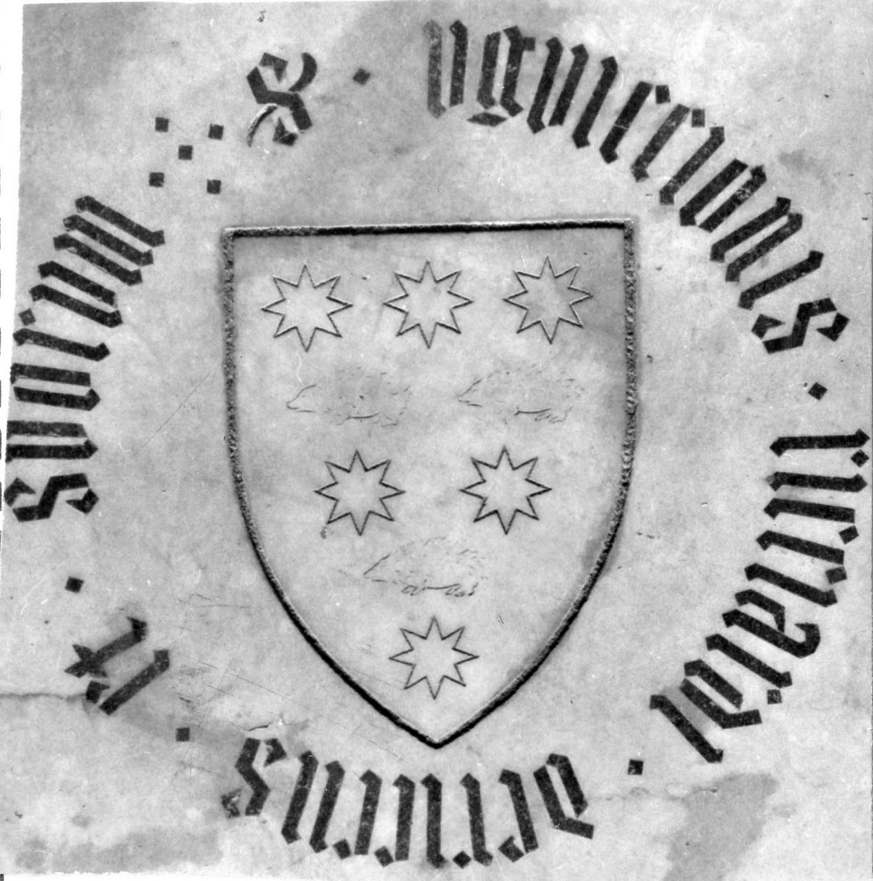 Lastra in marmo bianco con iscrizione intorno allo scudo.. Araldica