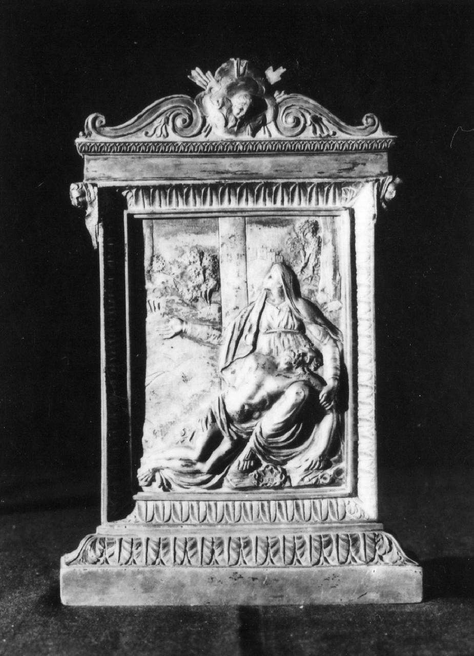 La pace, con cornice rettangolare liscia è definita lateralmente da due volute d'acanto che includono in basso un fiore aperto. Il fastigioè formato da due volute sormontate al centro da una infiorescenza a ventaglio. All'interno è raffigurato il Cristo "Ecce Homo".. Soggetti sacri. Personaggi: Cristo; Madonna