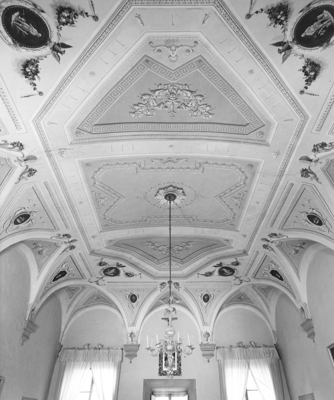La sala principale della foresteria presenta un soffitto a botte ribassato con unghiature, interamente dipinto. La parte centrale ha riquadrsture geometriche; agli angoli ci sono quattro medaglioni dipinti a monocromo. I pennacchi, tre sulla pareti più lunghe e due su quelle più corte, sono decorati con scomparti triangolari.. Decorazioni: ghirlande; greche; mascheroni; motivi vegetali; foglie d'acanto; conchiglie. Allegorie-simboli: quattro stagioni. Animali: aquila