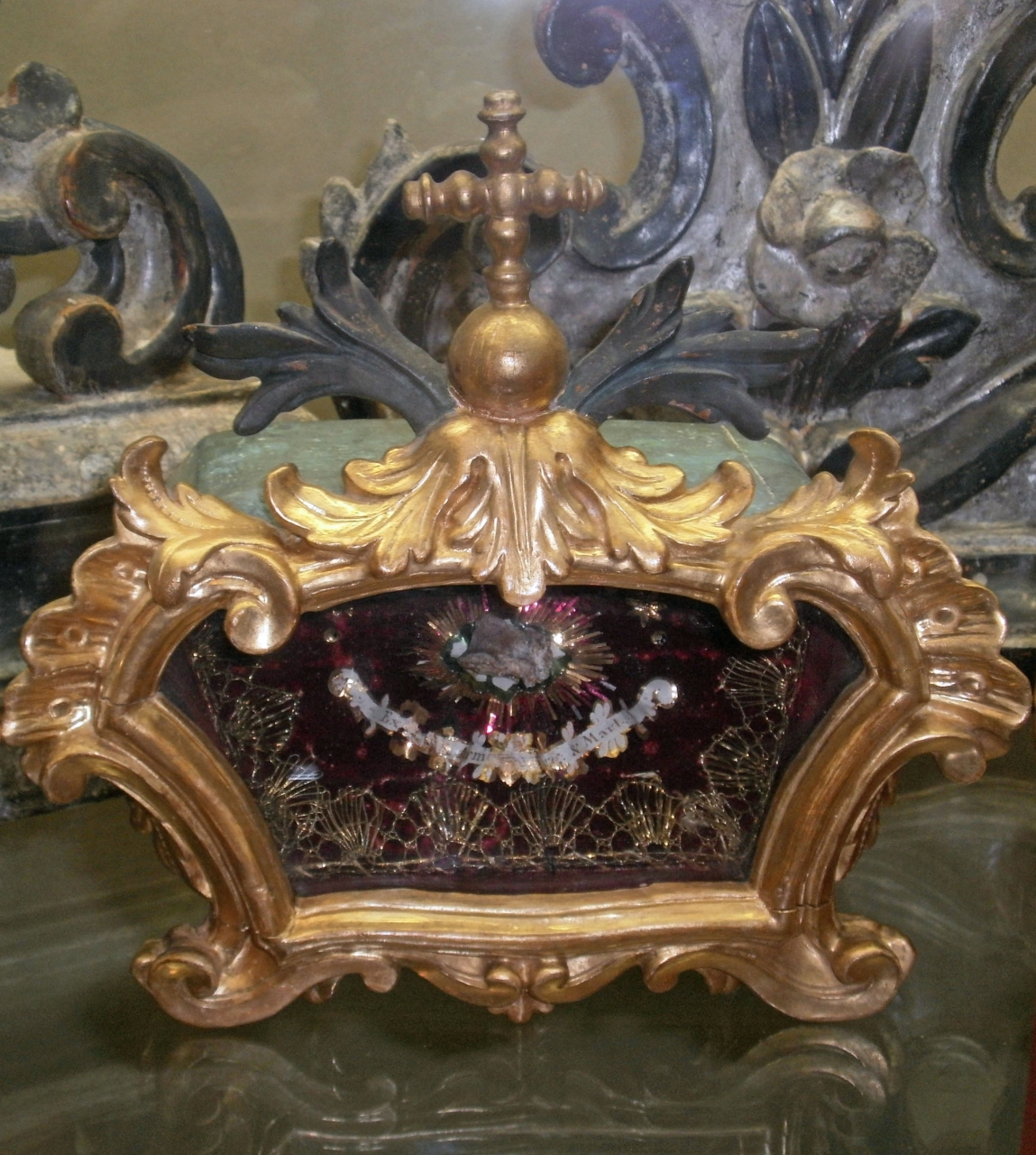 Reliquiario ad urna con andamento trapezoidale, poggiante su due piccole volute, mosso ed arricchito da motivi vegetali e riccioli. Il coperchio è sormontato da una croce poggiante su globo.. Simboli del martirio: croce. Allegorie-simboli: globo. Decorazioni: volute; riccioli. Vegetali: foglie d'acanto