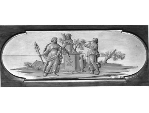 Dipinto a monocromo raffigurante due Vestali che offrono i fiori e suonano davanti al busto di Marsia.. Figure: Vestali. Personaggi: Marsia