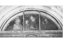 Affresco strappato e montato su pannello proveniente dall'antico battistero urbano, costruito in epoca imprecisata ma medievale. Il margine destro dell’affresco pare rifilato, poiché s’intravede il panneggio di un altro santo.. Personaggi: Madonna; Gesù Bambino; San Giovanni Evangelista. Figure maschili: devoto inginocchiato o piuttosto una devota a giudicare dalla veste e dalla collocazione alla destra della Vergine. Attributi: (Madonna) tiene sulle ginocchia Gesù bambino; (Santo) tiene in mano un libro. Mobilia: trono goticheggiante e con accenni di resa prospettica