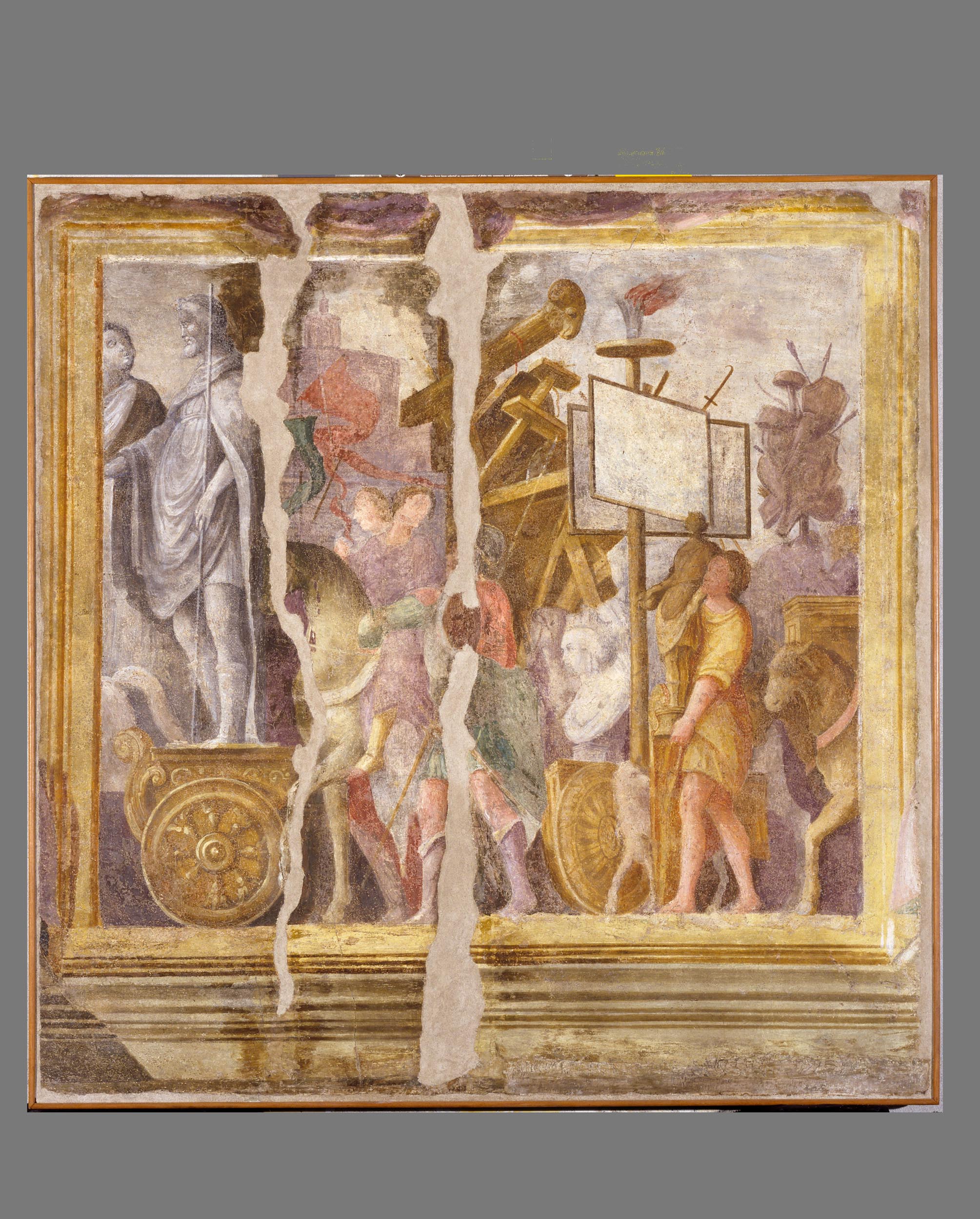 Affresco strappato e montato su pannello. Copia della seconda tela del ciclo "Trionfi di Cesare".. Soggetti profani: carri trionfali; trofei; macchine belliche