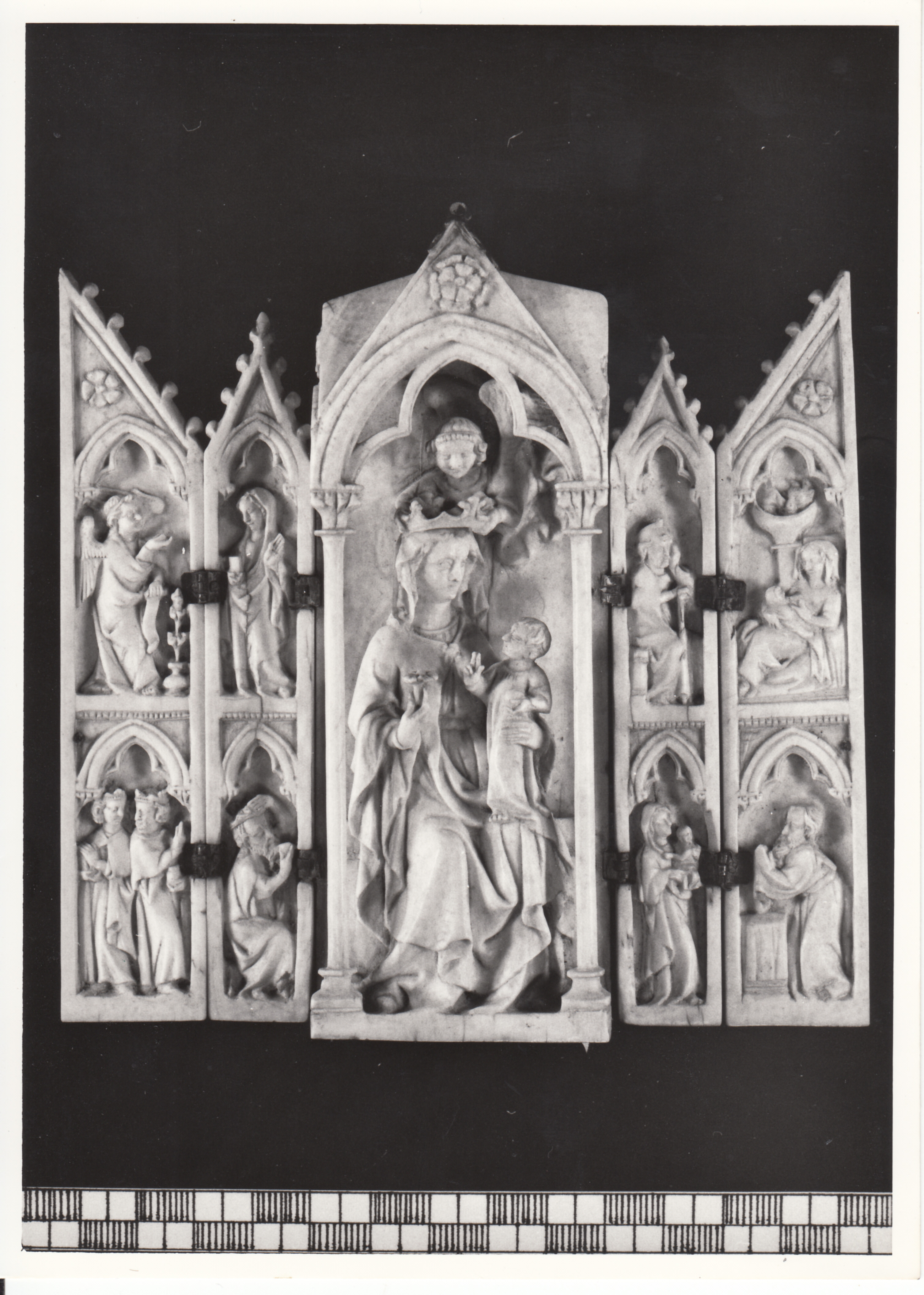 Polittico a sportelli formato da cinque lastre di avorio, incerniate tra di loro e richiudibili mediante un piccolo gancio che si inserisce in un occhiello. In cima alla cuspide dell'edicola centrale è applicato un cappuccio metallico di forma lobata, terminante con un occhiello, per mezzo del quale l'oggetto poteva essere appeso. Nell'edicoletta sostenuta da due colonnine è rappresentata quasi a tutto tondo la figura della Vergine seduta, mentre porge un fiore al figlio benedicente che tiene sulle ginocchia; un angelo che scende dall'alto le pone una corona sul capo. La raffigurazione è sormontata da un arco a doppia ghiera, internamente trilobato. Nelle ante laterali, suddivise mediante listelli orizzontali forniti di un bordo di perline, sono raffigurate in otto comparti scene della vita di Cristo, ciascuna inquadrata da un archetto pensile trilobato. Le due ante di sinistra recano la raffigurazione dell'Annunciazione nella parte superiore e l'Adorazione dei Magi in quella inferiore; le due di destra la Natività e la Presentazione al Tempio. Gli sportelli terminano superiormente con una cuspide ornata di semplici crochets; i più esterni, di dimensioni maggiori, recano nel timpano anche una larga rosetta.. Soggetti sacri. Personaggi: Madonna, Gesù bambino benedicente, angelo. Attributi: (Madonna) corona, fiore. Abbigliamento (Madonna): velo corto, mantello.; Soggetti sacri: Annunciazione. Personaggi: Maria Vergine, Angelo.; Soggetti sacri: Adorazione dei Magi. Personaggi: Gaspare, Baldassarre, Melchiorre. Attributi: (magi) doni. Attività umane: (Melchiorre) sollevamento della corona dal capo.; Soggetti sacri: Natività. Personaggi: Madonna, Gesù Bambino, Giuseppe. Attività umane: allattamento al seno. Interno: giaciglio, seduta.; Soggetti sacri: Presentazione al tempio.; Decorazioni: architetture tridimensionali