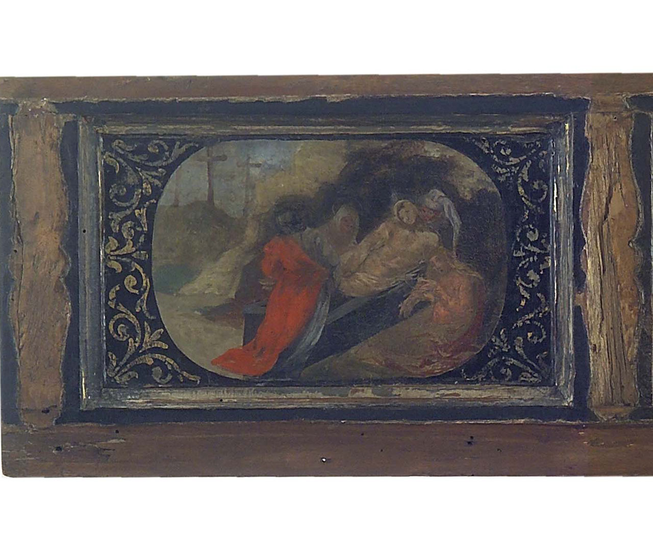 Scomparto di predella.. Personaggi: Cristo morto; Madonna; Santa Maria Maddalena; San Giovanni Evangelista; Maria di Cleofa. Oggetti: sepolcro. Veduta: Gerusalemme: Monte Calvario. Simboli della passione: croci