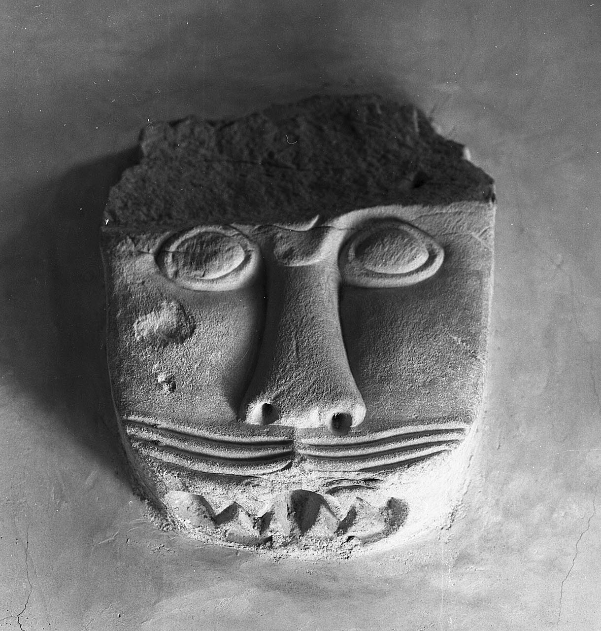 Maschera leonina in pietra calcare scolpita, con occhi ovoidali, naso appiattito, grande bocca munita di denti acuminati e sottili solchi che indicano i baffi.