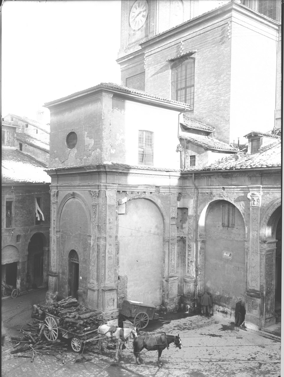 Italia - Emilia-Romagna - Bologna - Chiesa dei Santi Bartolomeo e Gaetano; Architettura religiosa - Chiese - Elementi architettonici - Cappelle; Centri storici - Piazze; Veicoli a trazione animale - Carri; Animali - Cavalli, Bologna - Piazza di Porta Ravegnana - Chiesa dei Santi Bartolomeo e Gaetano - Cappella della Madonna della Porta prima del restauro