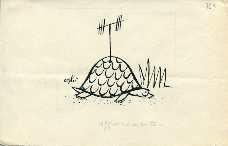 Disegno a china su carta avorio filigranata.. Vignetta umoristica che raffigura una tartaruga con una antenna sopra il carapace