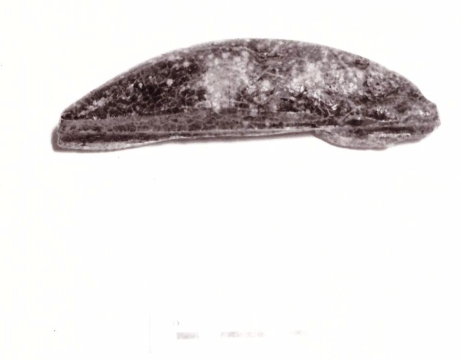 Nucleo di ambra ovale, allungato, a sezione lenticolare, forato al centro nel senso della lunghezza.