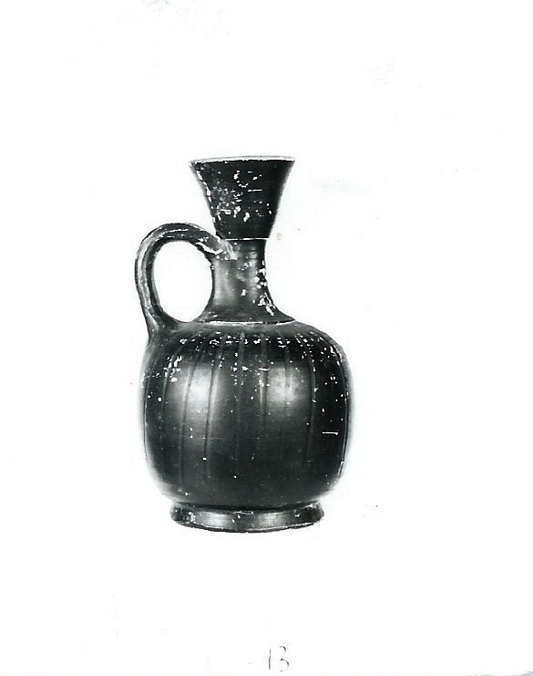Argilla beige depurata e compatta; vernice nera metallica lucente, uniforme. bocca troncoconica; stretto collo cilindrico con leggero solco all’unione con la spalla; corpo pressoché globulare; sul corpo striature verticali incise. Piede svasato. Ansa a nastro impostata sulla spalla e sul collo. Fondo del piede risparmiato.