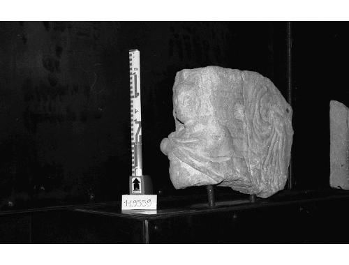 porzione angolare di un sarcofago, decorata con una figura virile di cui si conservano la testa ed il torso, dalla possente muscolatura, coperto in parte da un mantello appuntato con una bulla sulla spalla destra. A destra di questa figura si riconosce la parte sinistra di una palmetta con i petali rivolti verso il basso, scolpita a rilievo molto basso. La parte interna della cassa marmorea presenta un profilo curvilineo ed appare sgrossata a gradina.