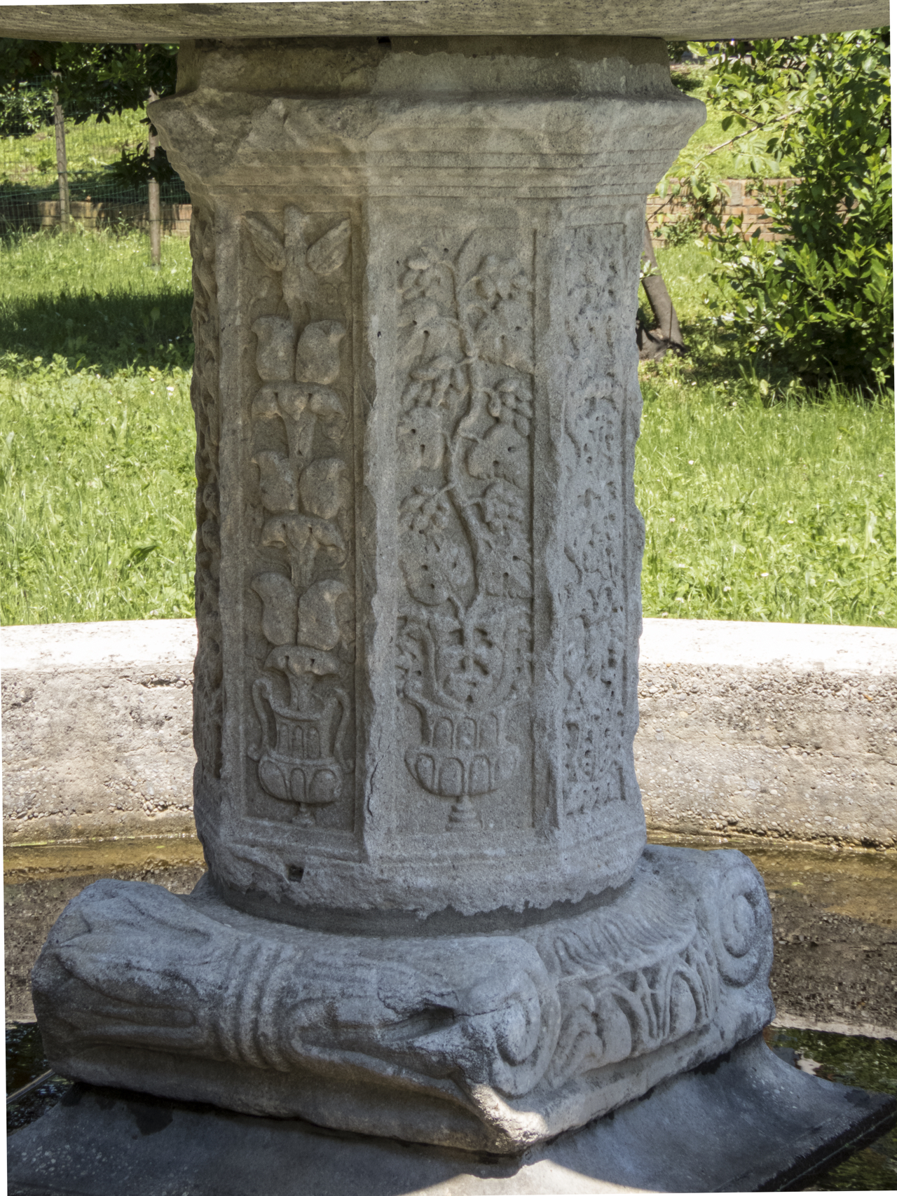 pilastro a base ottagonale avente le facce racchiuse in cornicette concentriche. I singoli spazi interni sono decorati da fiori, foglie, tralci di vite e racemi che escono da vasi. Solo in una sezione sulla sommità della pianta c’è un uccello ad ali spiegate. Il pilastro termina superiormente con una spessa cornice sagomata. Si osserva sempre in prossimità di questa cornice un foro forse già utilizzato per cannella di fontana.. decorazioni