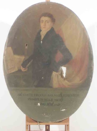 Ritratto in piedi, con una bandiera bianca e rossa alle spalle. Accanto al ragazzo uno scrittoio con un disegno d'architettura e uno spartito musicale. Iscrizione in basso, senza cornice.. RITRATTI: Ercole Saracco