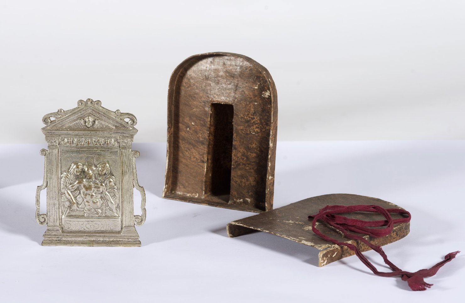 Ha il consueto modulo a tempietto con timpano e lesene, includenti la scena della deposizione nel sepolcro con Maria e Giovanni, a rilievo. Conservato dentro una custodia di cartone rivestita.. PERSONAGGI: CRISTO; MADONNA; SAN GIOVANNI EVANGELISTA. STRUMENTI DEL MARTIRIO: CROCE