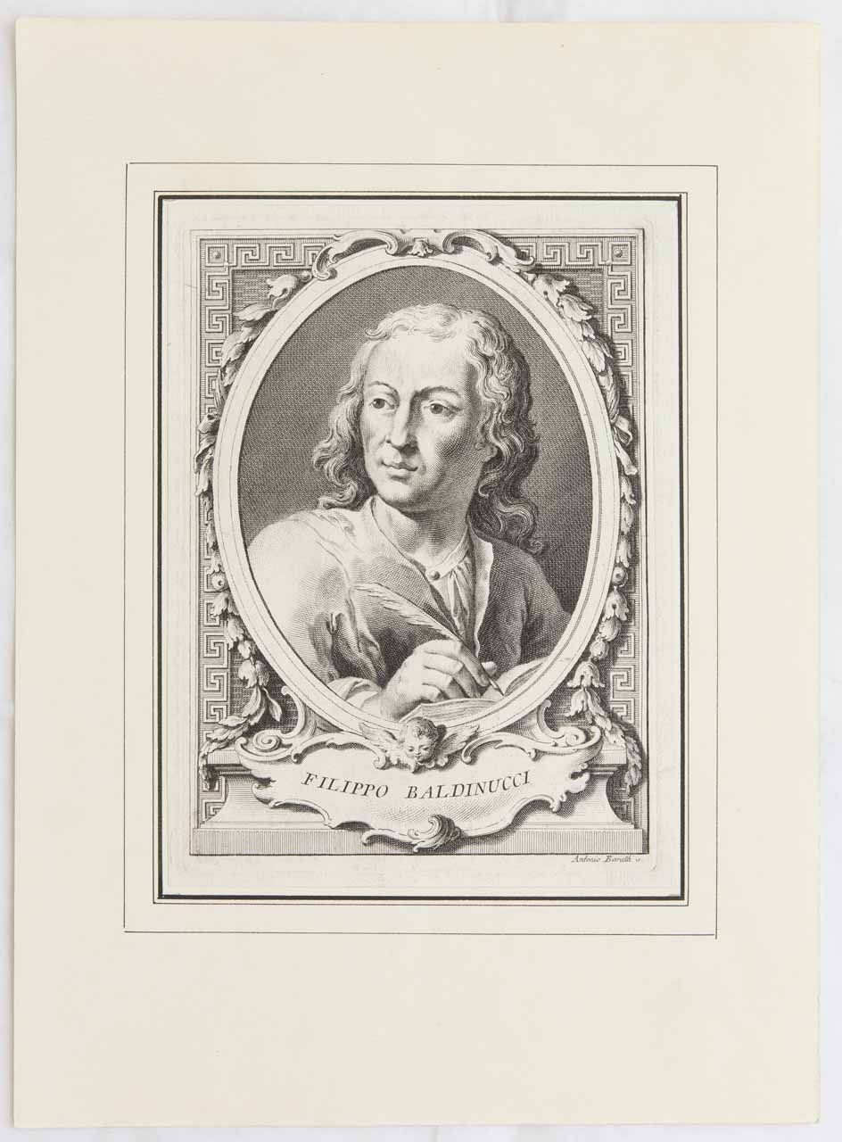 Ritratti: Baldinucci Filippo. Oggetti: cornice decorativa ovale; penna d'oca; libro; cartiglio. Decorazione. Figure: cherubino. Vegetali: fiori; fronde