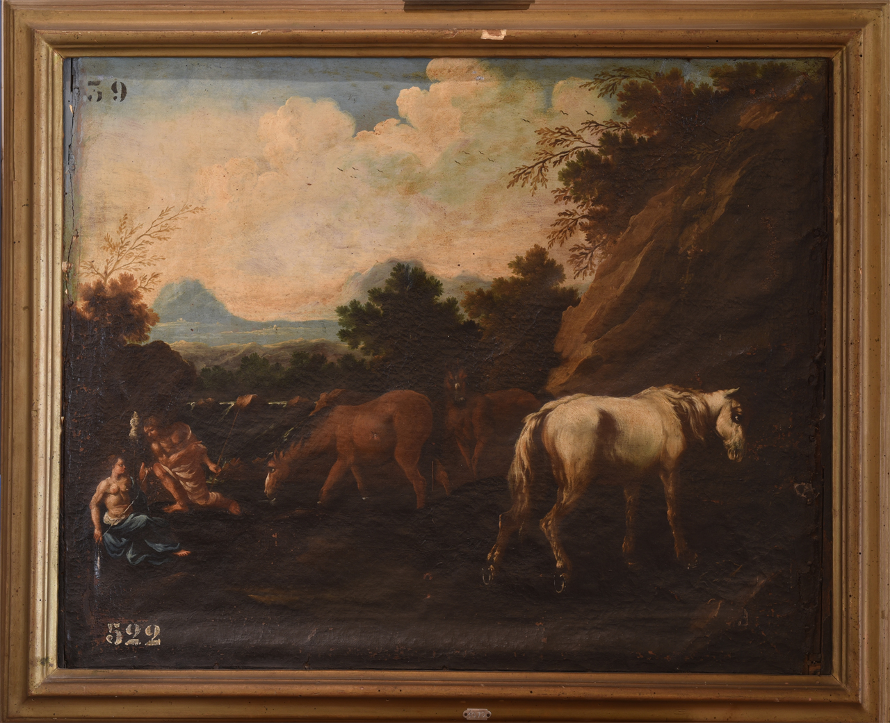 Dipinto con cornice modanata e dorata.. Paesaggio: rocce. Piante: alberi. Figure: uomo; donna. Abbigliamento. Animali: cavalli; uccelli. Fenomeni naturali: nuvole. Oggetti: rocca; fuso; filo; bastone