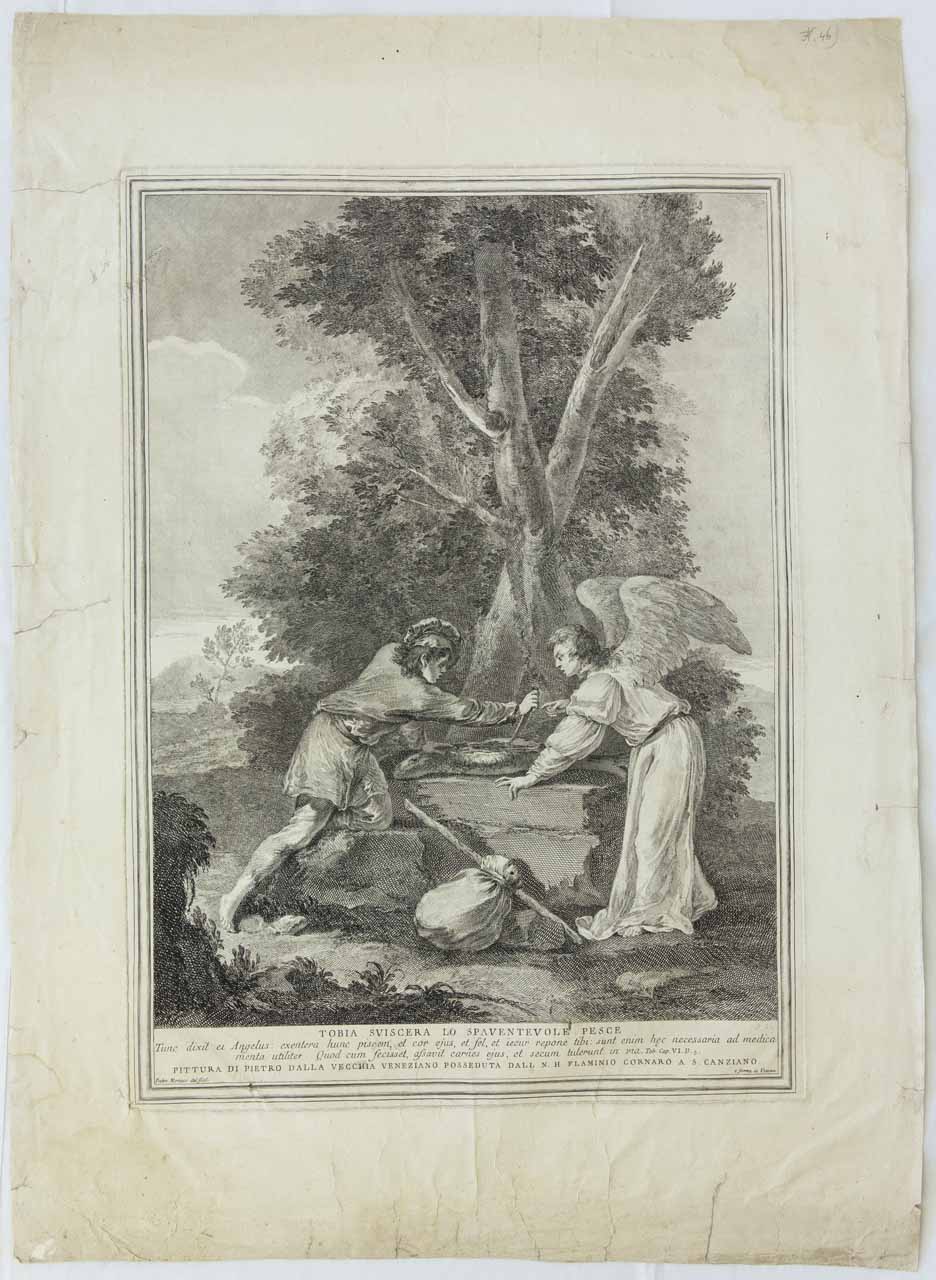 Personaggi: Tobia; San Raffaele Arcangelo. Oggetti: coltello; sacco; pietre; bastone. Animali: pesce. Paesaggio: paesaggio con alberi. Piante: albero