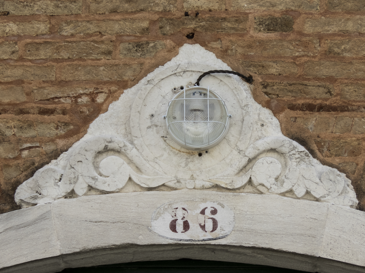 comparto rettangolare decorato con cornice circolare a listello piatto su motivi decorativi a voluta, disposti orizzontalmente nella parte inferiore. Il centro del rilievo non è visibile a causa di una lampada da muro fissata sopra. decorazioni