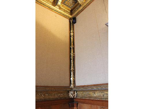 L’ambiente prevede, come collegamento tra il termine del soffitto e le specchiature della boiserie collocate nella parte inferiore delle pareti, 4 candelabre angolari intagliate in legno e fregiate con applicazioni d’ornato a pastiglia. Partendo dall’alto, ogni candelabra è così composta: capitellino corinzio cui è sottoposta colonnina tortile rastremata, vaso a doppia ansa, elemento simmetrico rastremato al centro e ornato con foglie d’acanto, elemento con cherubino, elemento rastremato riccamente decorato con motivi a grottesca terminante in una coppa baccellata, elemento con cartiglio vuoto retto da un complesso sistema di sostegno con fili e perle (?). Brown 2005 segnala che le 4 candelabre angolari sono intagliate solo nel fianco a vista.. Decorazioni: girali fitomorfi; grottesche; mascheroni
