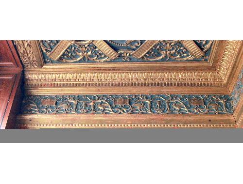 La cornice lignea del soffitto a copertura del recesso corre perpendicolare allo stesso pannello piano conchiudendolo su tre fianchi, a parte quello della finestra. La decorazione presenta uno schema prossimo a quello di una trabeazione classica, dove la banda inferiore riporta sottili modanature ed una fascia a perline ovali. La cornice superiore è d’altro canto più ricca e complessa, con i seguenti tre ordini: a palmette, a perline e fusarole ed infine a dentelli classici. Il fregio, realizzato con applicazioni in pastiglia a policromia oro su azzurro (richiamo ai colori estensi), riproduce peraltro una complessa grottesca dove girali fitomorfici e animali si intrecciano e inquadrano in una successione alternata le imprese isabelliane delle Pause e del Candelabro.. Decorazioni: girali fitomorfi; grottesche; rosette; cartigli.; Araldica:imprese