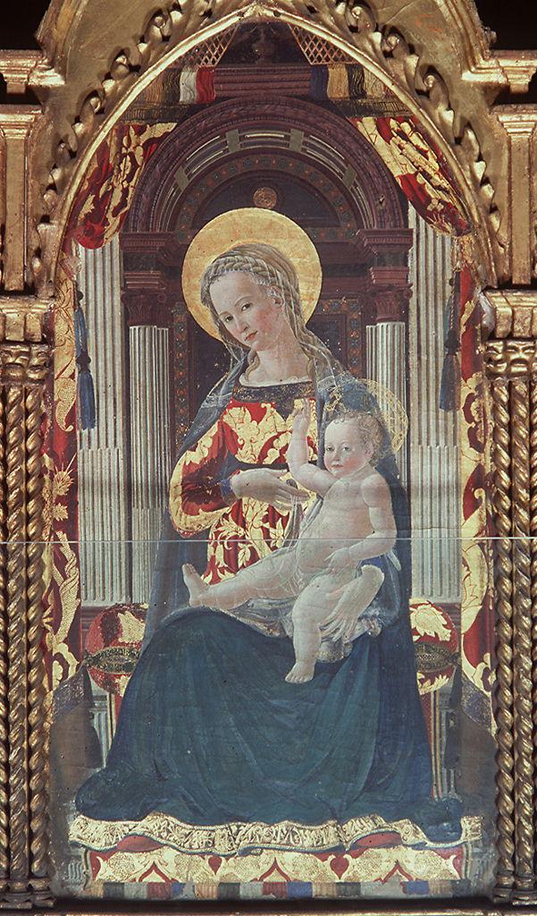 n.p.. Soggetti sacri. Personaggi: Madonna; Gesù Bambino. Abbigliamento: tunica damascata; mantelli; velo; acconciatura. Oggetti: trono; tendaggi; cuscino; vaso. Vegetali: fiori