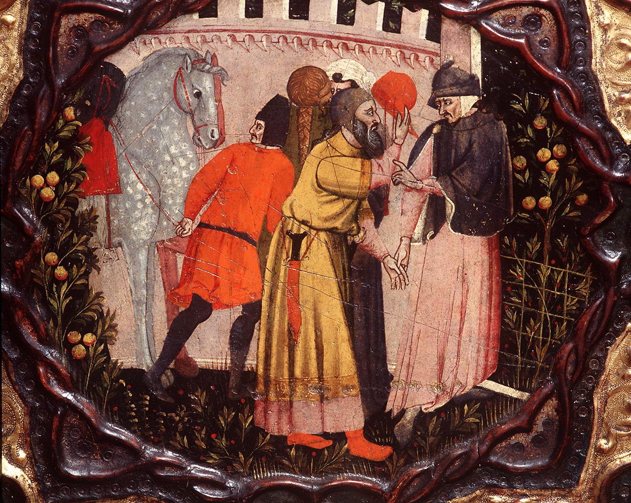 n.p.. Soggetti profani. Personaggi: Torello; Saladino. Figure maschili: compagni. Abbigliamento: vesti; manti; copricapi; cinture; calzebrache. Paesaggi: prato. Architetture: mura. Oggetti: recinto; sella; armi. Vegetali: alberi da frutta; cespugli di bacche. Decorazioni: motivi floreali