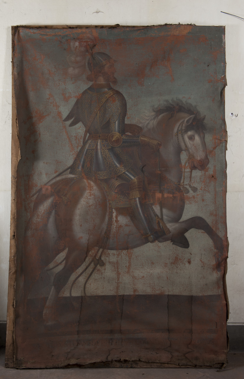 Ritratto equestre maschile, a figura intera con testa di profilo e spalle rivolte allo spettatore. Il cavaliere cavalca un cavallo impennato. Indossa un armatura con finiture auree, la cintura, l'elmo. Porta la spada al fianco sinistro. PERSONAGGI: Amedeo di Savoia; ABBIGLIAMENTO: armatura, elmo; ANIMALE: cavallo; ARMI: spada; OGGETTI: briglie, sella