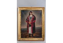 Uomo in piedi a figura intera, testa volta verso destra con lunga e voluminosa barba scura. Indossa un custume regionale con giacca scura, corpetto rosso con bordo blu e camicia bianca, pantaloni tagliati poco sotto il ginocchio di colore chiaro, stivali e un cappello floscio che ricade verso destra. La figura impugna un fucile con la mano destra e tiene la sinistra appoggiata al pugnale che è infilato alla cintola. Ai suoi piedi un cane scuro accovacciato. Sullo sfondo una pianura, forse una marina, con alcue rocce e una catena di monti in lontananza. Cornice di legno dorata con ornati in gesso agli angoli. La cornice è interessata da qualche ammanco del rilevo sul profilo interno. FIGURA: maschile; ABBIGLIAMENTO: costume regionale; ANIMALI: cane; ARMI; fucile, pugnale; PAESAGGIO: rocce, pianura, catena montuosa, elemento acqueo