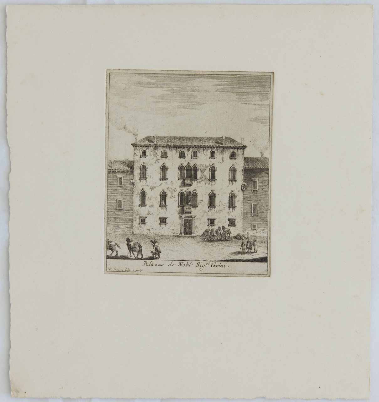 Oggetti: sacchi. Animali: cavalli. Veduta: Belluno: Palazzo Grini. Architetture: Belluno: Palazzo Grini: esterno. Figure