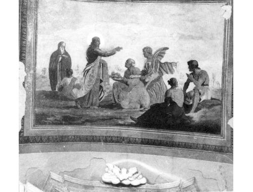 Cristo, in piedi, benedice i pani ed i pesci che gli vengono recati da due apostoli genuflessi. La scena, che si svolge all'aria aperta, è osservatad a pochi astanti.