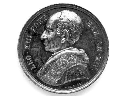 ritratto di papa Leone XIII, allegoria dell'astronomia che indica la specola vaticana (medaglia pontificia)