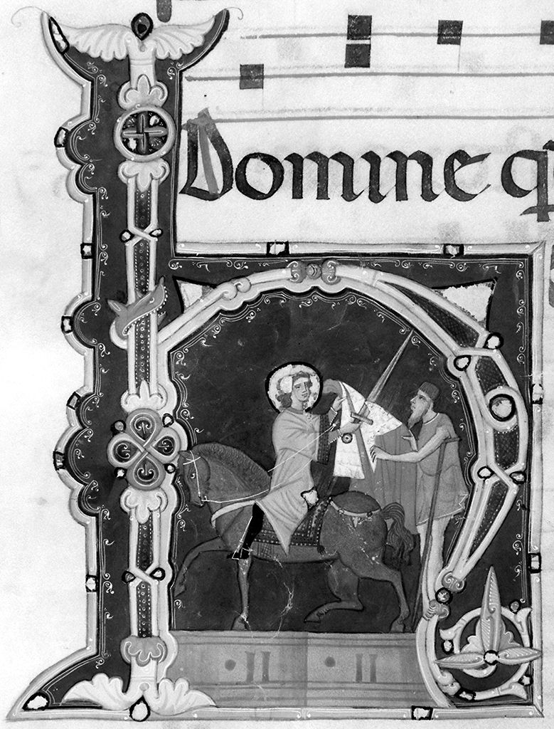 lettera H, San Martino dona parte del mantello al povero (miniatura)