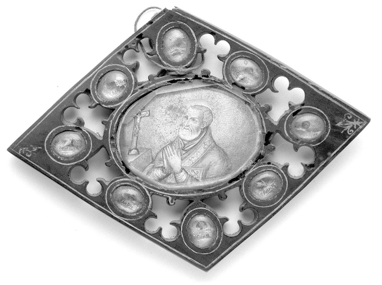 Santo in preghiera davanti al crocifisso (reliquiario a capsula)