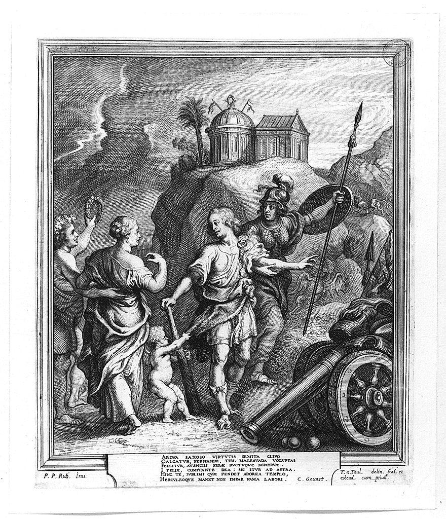 Eroi: Ercole. Attributi: (Ercole) clava; pelle di leone. Allegorie-simboli: Vizio; Virtù. Figure. Armi: cannone; scudo; lancia. Costruzioni: tempio
