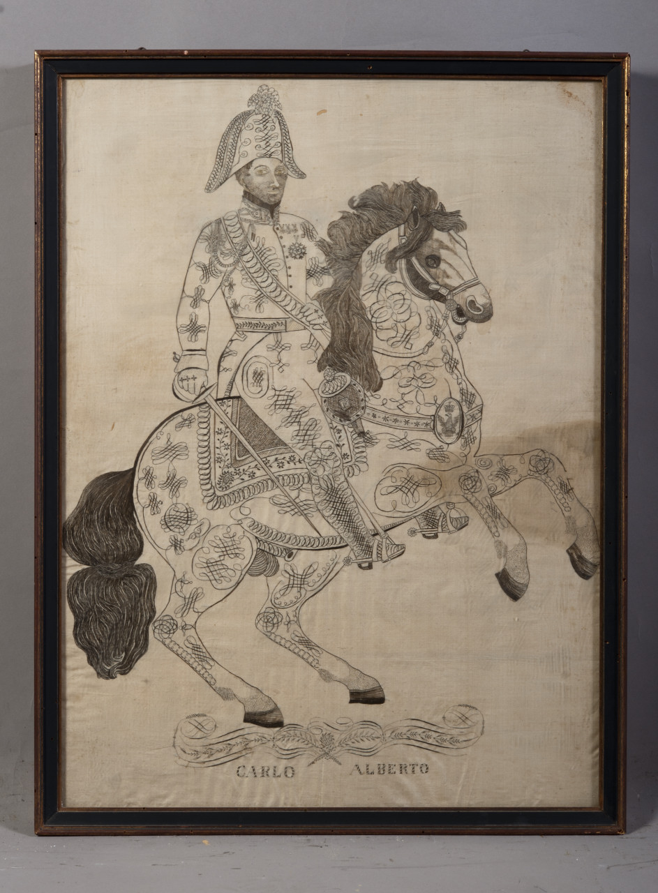Ritratto maschile a figura intera, sopra un cavallo impennato di profilo e volto a sinistra. La testa della figura è quasi di fronte e porta una feluca. Indossa una divisa militare con una fascia che attraversa il petto e alcune decorazioni militari, le cordelline, una cintura in vita e stivali con speroni. Tiene la sciabola nella mano destra e calza dei guanti. Cornice di legno verniciato in nero e filettato in oro. Cornice munita di vetro. PERSONAGGI: Carlo Alberto di Savoia-Carignano; ABBIGLIAMENTO: feluca, divisa militare, fascia onorifica, decorazioni militari, cordelline, stivali, cintura, guanti; ARMI: sciabola; ANIMALI: cavallo