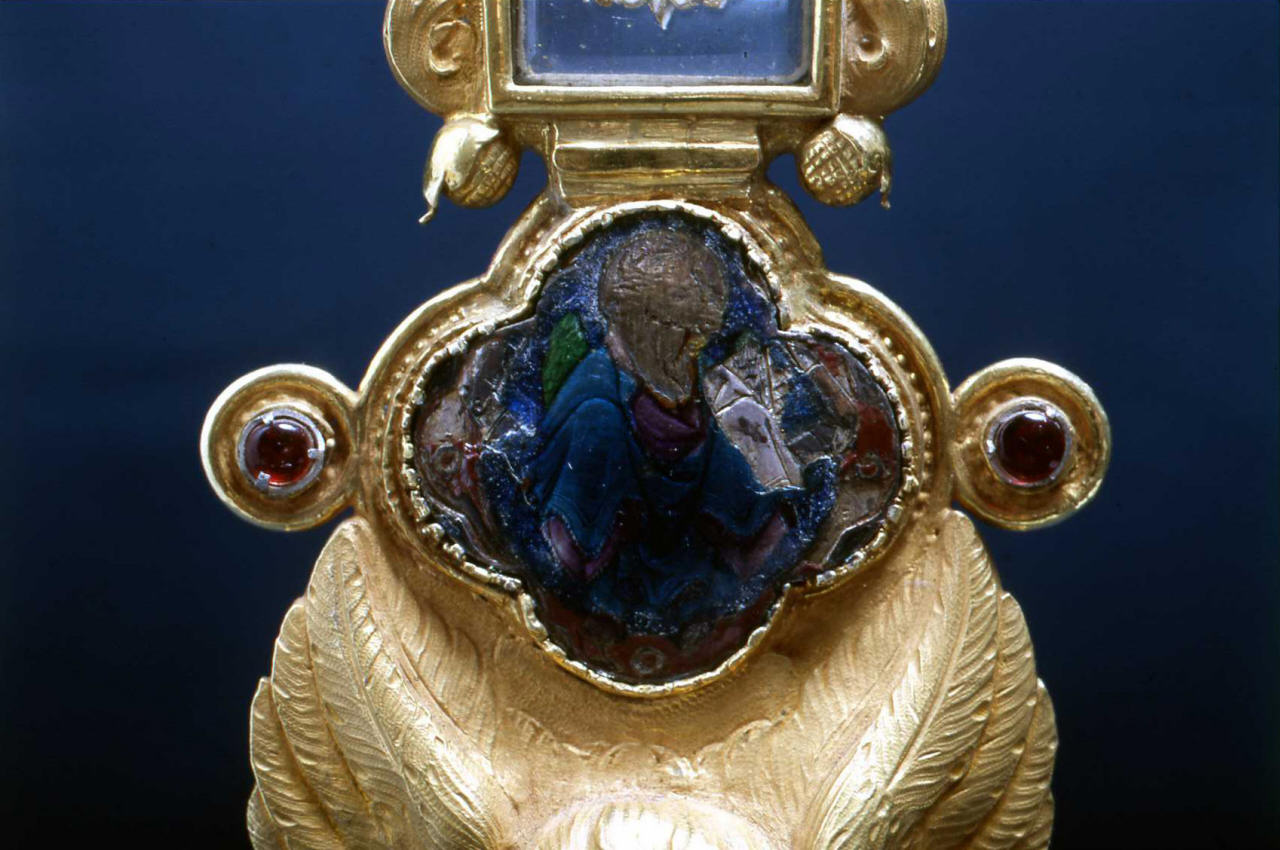 n.p.. Soggetti sacri. Personaggi: San Luca. Attributi: (San Luca) cartiglio. Simboli: (San Luca) figura umana con testa di toro. Oggetti: cartiglio. Decorazioni: rosette