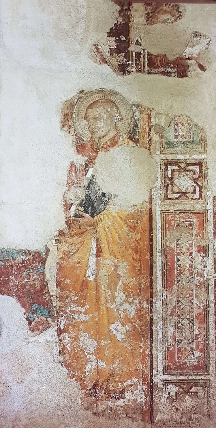 Frammento di dipinto murale.. Il dipinto rappresenta santo Stefano abbigliato con stola e dalmatica e con il libro in mano. Sulla destra si vede ancora la cornice entro cui era inserito caratterizzata da inserti di tipo cosmatesco nei toni rosso verde e bianco