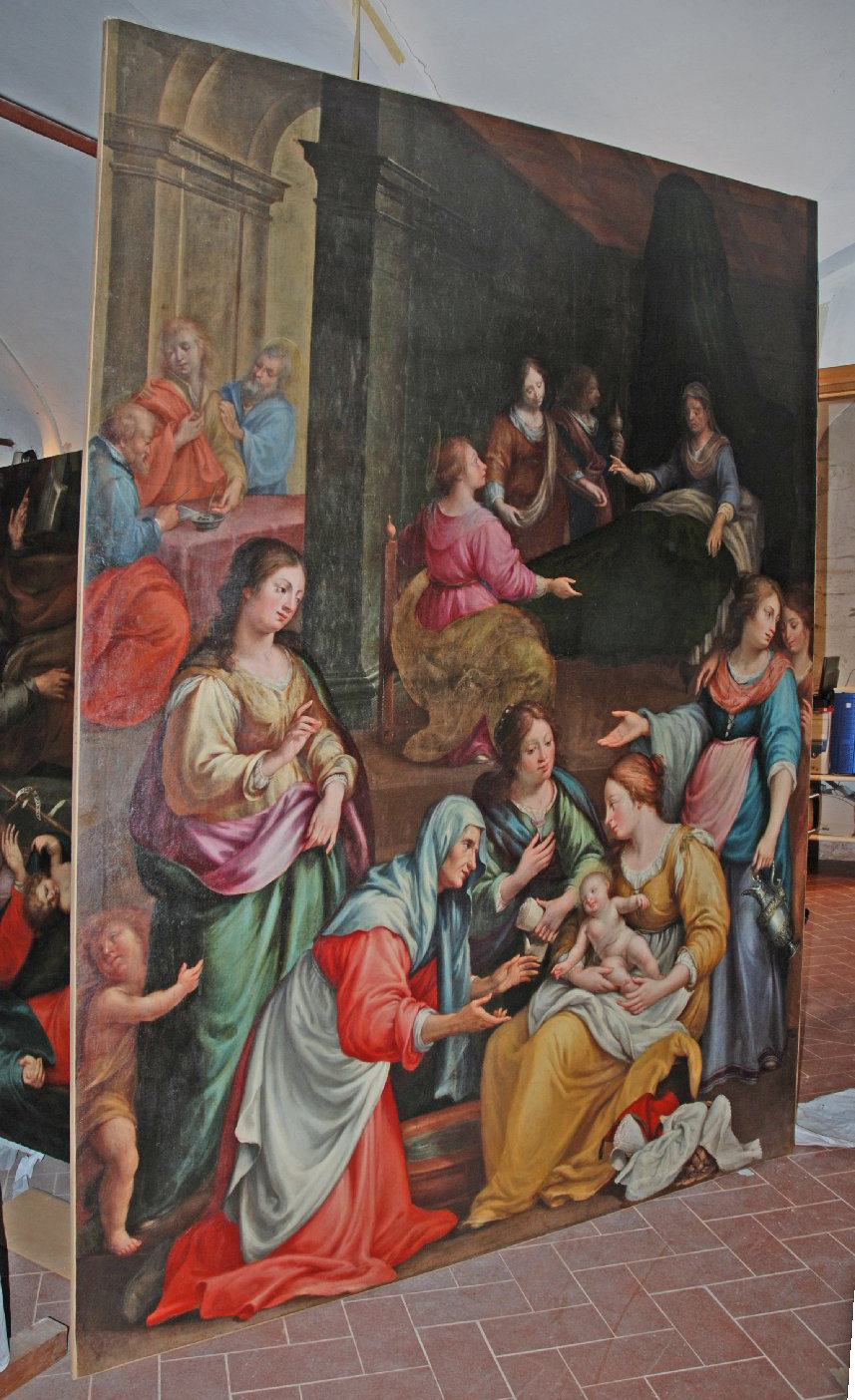 Dipinto a olio su tela di grande formato.. Il dipinto raffigura la nascita di San Giovanni Battista, in primo piano si vede il neonato attorniato da un gruppo di donne, mentre in secondo piano è raffigurata Sant'Elisabetta seduta sul letto accompagnata da altre donne