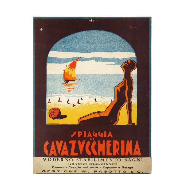 Lettura iconografica: figura femminile; bagnante; costume da bagno; spiaggia; ombrellone da spiaggia; mare; barca a vela. Categoria merceologica/ tipo evento: turismo; mare; stabilimenti balneari. Nomi: Spiaggia di Cavazuccherina; Ingegner Silvestri. Luoghi: Treviso; Venezia; Jesolo; Cavazuccherina