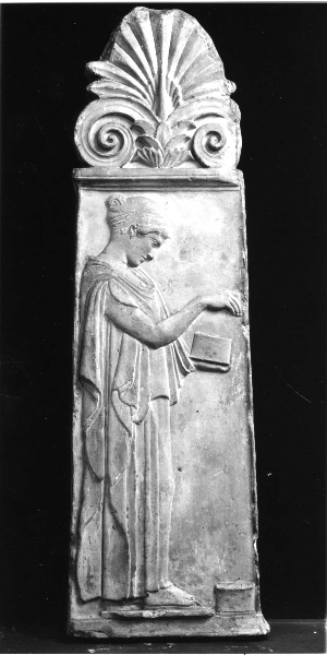 Stele funeraria decorata a bassorilievo con coronamento a palametta.. Figure: figura muliebre. Pratiche rituali: sacrificio
